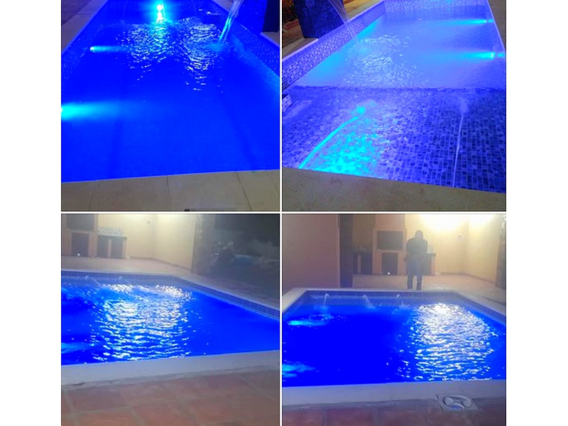 Piscina personalizada con hidromasaje, borde atérmico, luces led y cascadas.