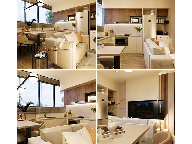 Compacto pero completo, aquí tienen esta sala, cocina y comedor con muebles planeados en tonos claros y amaderados.