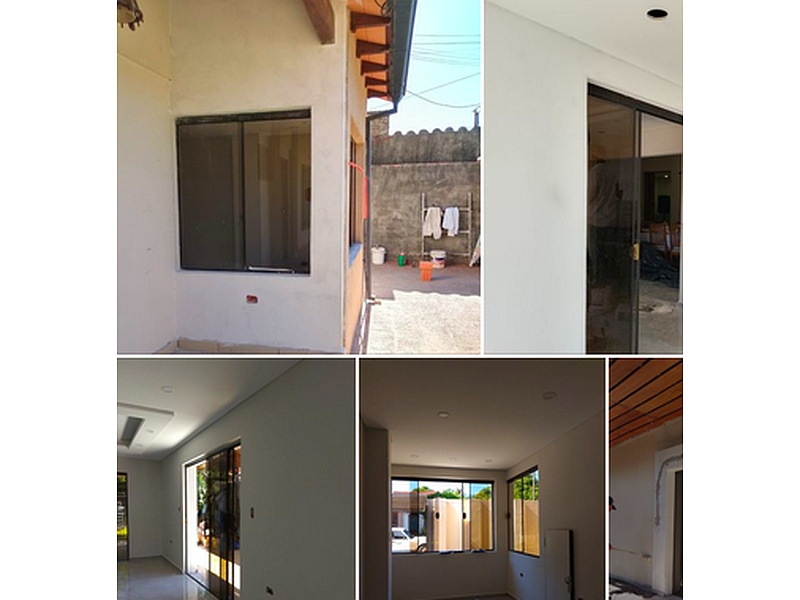 En fase de pintura con enduido y colocación de vidrios en puertas y ventanas.