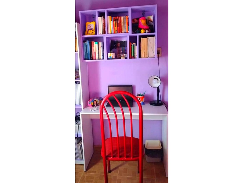 * Silla: Una silla de metal con respaldo curvo y asiento de color rojo, que contrasta con el blanco del escritorio y el morado de las paredes.
