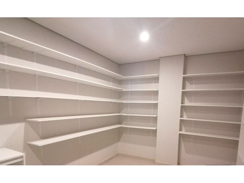 La característica principal son las estanterías flotantes que cubren casi todas las paredes. Estas estanterías son amplias y están dispuestas a diferentes alturas, creando un sistema de almacenamiento versátil.