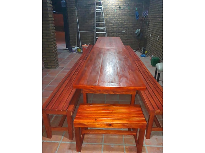 Mesa de jardín en madera color caoba.