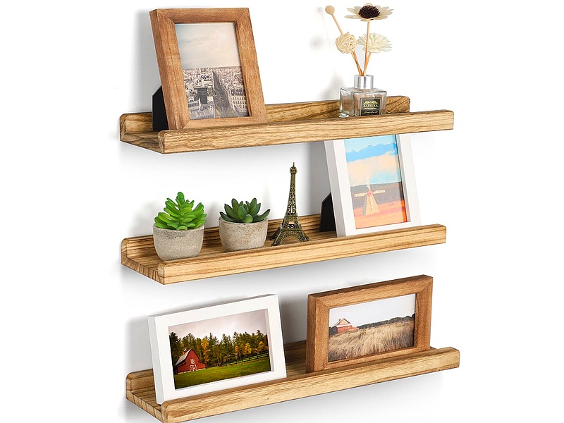 Estantería de madera con un diseño flotante, ideal para exhibir libros, plantas o decoraciones. Su acabado natural y su apariencia minimalista se integran perfectamente en cualquier habitación.