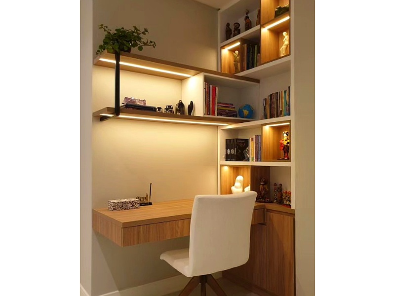 Escritorio esquinero con cajón y puertita, nichos abiertos con luces led decorativa.