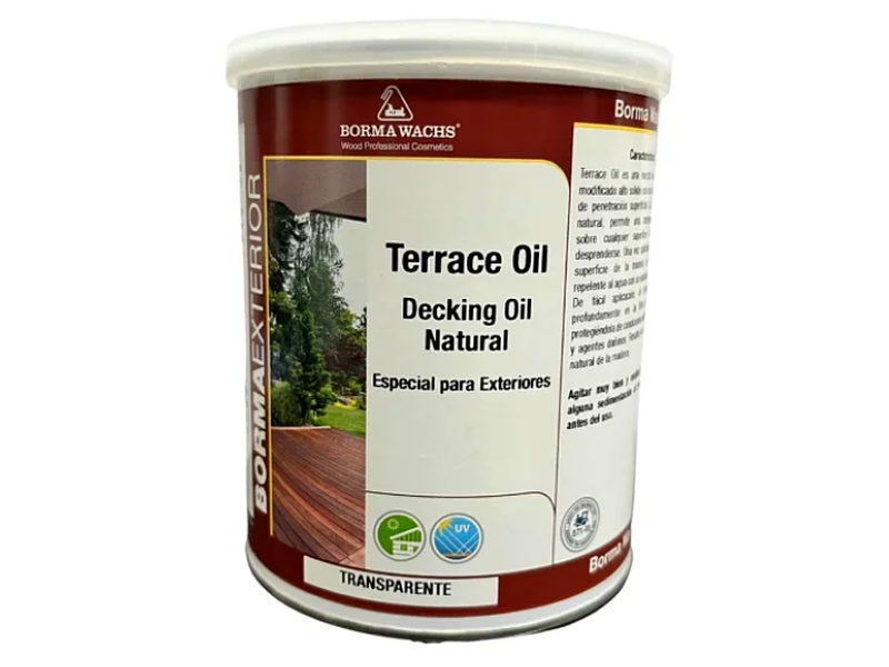 TERRACE OIL es una mezcla de aceites naturales y resinas, especiales para el acabado de exteriores. suelos de madera, perfectos para maderas exóticas y superficies cercanas a piscinas, que no se agrieten ni pelar. Gracias a su alta humectación propiedades, alto contenido de sólidos y baja viscosidad, es ideal para nutrir, proteger y decorar o restaurar terrazas, aportando resistencia al agua, intemperie y tránsito peatonal. El especial Las versiones pigmentadas otorgan un acabado natural y uniforme. efecto de color. Aplicación extremadamente fácil y mantenimiento (amplio tiempo abierto incluso en condiciones difíciles) condiciones climáticas, no es necesario lijar). Enriquecido con filtros UV y aditivos contra agentes nocivos para la madera, es la solución ideal para cualquier superficie de madera exterior.