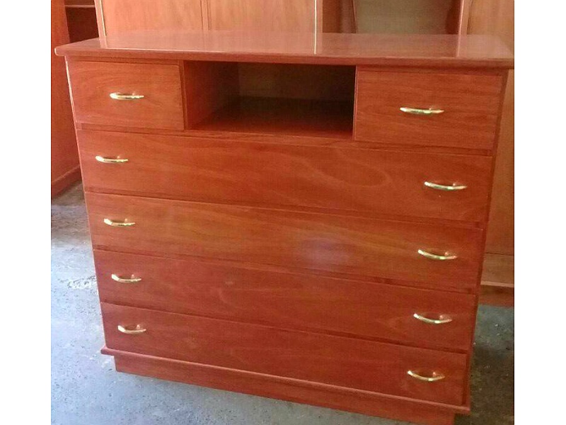 Incluye varios cajones espaciosos con tiradores de hierro forjado o bronce, proporcionando un espacio de almacenamiento práctico para ropa, accesorios y otros artículos personales.