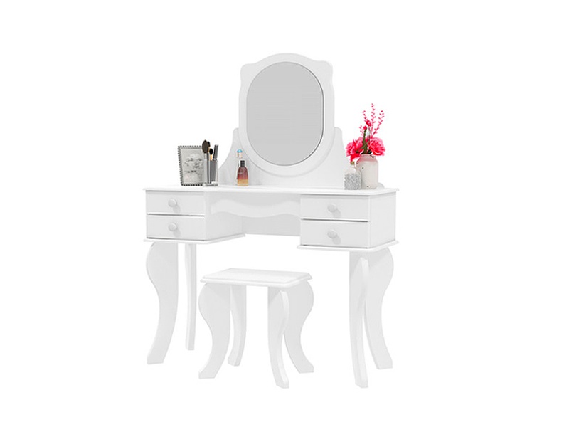 Tocador estilo princesa, con un diseño elegante y delicado, acompañado de espejo y cajones, perfecto para organizar cosméticos y accesorios.