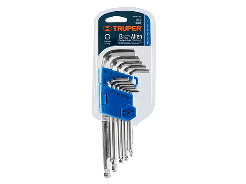 El Juego de 13 Llaves Allen Largas con Punta Bola y Organizador, Truper incluye un conjunto de llaves de alta calidad diseñadas para ofrecer un acceso cómodo a tornillos en espacios de difícil alcance. Las llaves tienen puntas de bola que permiten ángulos de trabajo de hasta 25 grados, facilitando el ajuste de tornillos en posiciones complicadas.