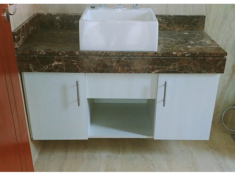 Un modular de baño moderno que ofrece gran capacidad de almacenamiento con estantes y cajones, perfecto para cualquier baño.
