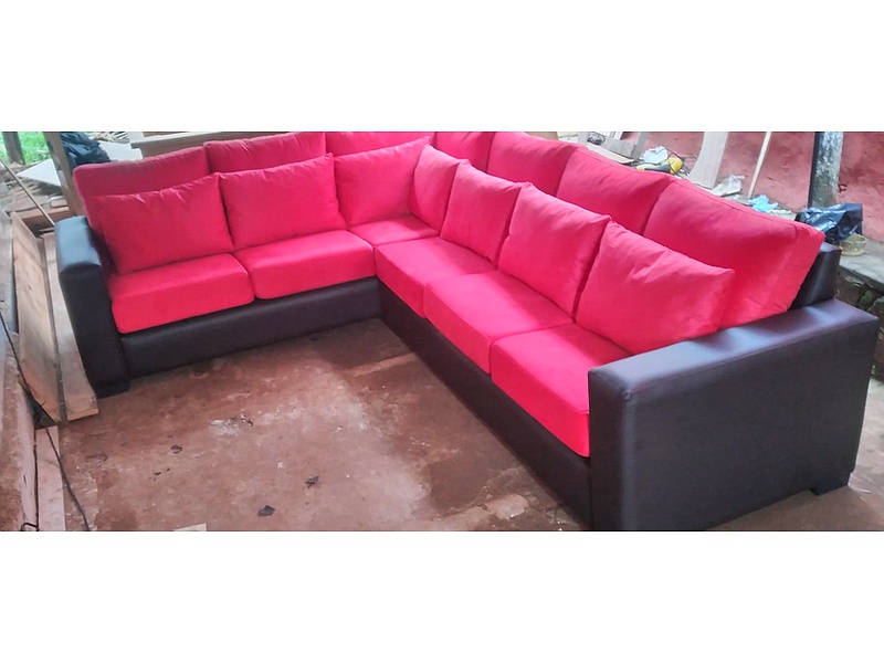 Sofá en L color rosado.