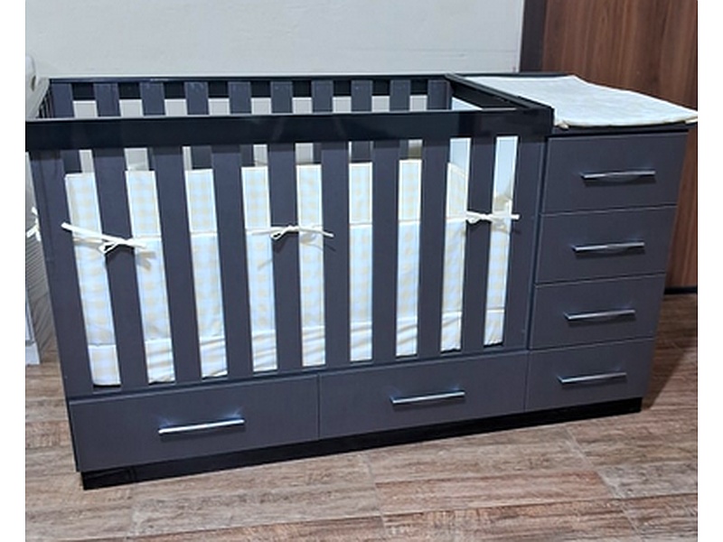 Cama cuna con almacenamiento en color gris.