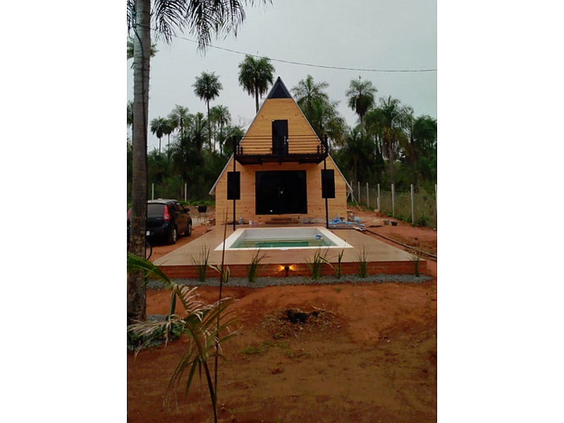 Construccion de casa estilo cabaña, con piscina y garaje.