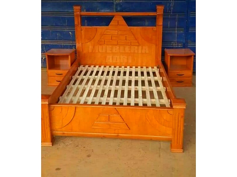 Cama hecha de madera en color natural.