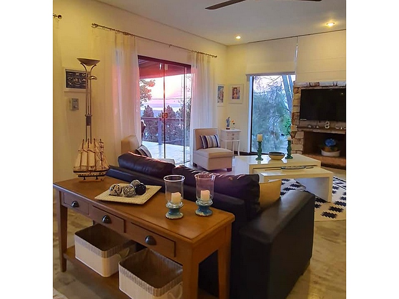Sala de estar acogedora y bien iluminada, con un estilo contemporáneo que combina elementos clásicos. Destacan los muebles oscuros que contrastan con la claridad de las paredes y los detalles decorativos en tonos suaves.