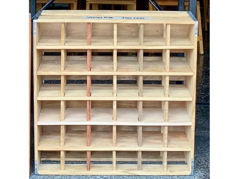 Estructura: La estantería parece ser bastante robusta, con una base y lados sólidos. Los compartimentos están delimitados por listones de madera que se entrecruzan, formando una especie de rejilla.