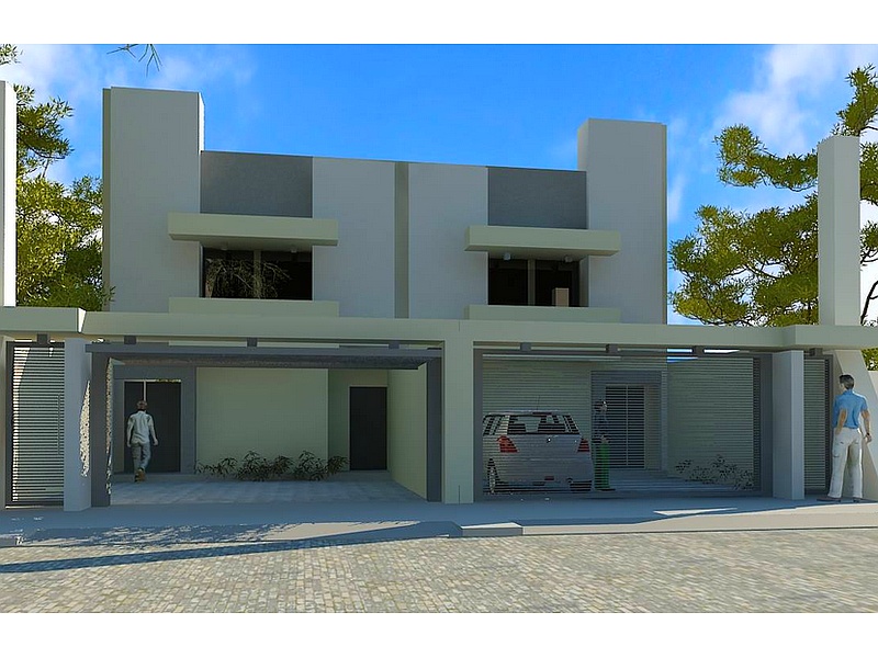 Un elegante dúplex de dos pisos en un tono gris sobrio y moderno, que destaca por su diseño contemporáneo. La fachada se caracteriza por líneas limpias y ventanales amplios que permiten la entrada de luz natural.