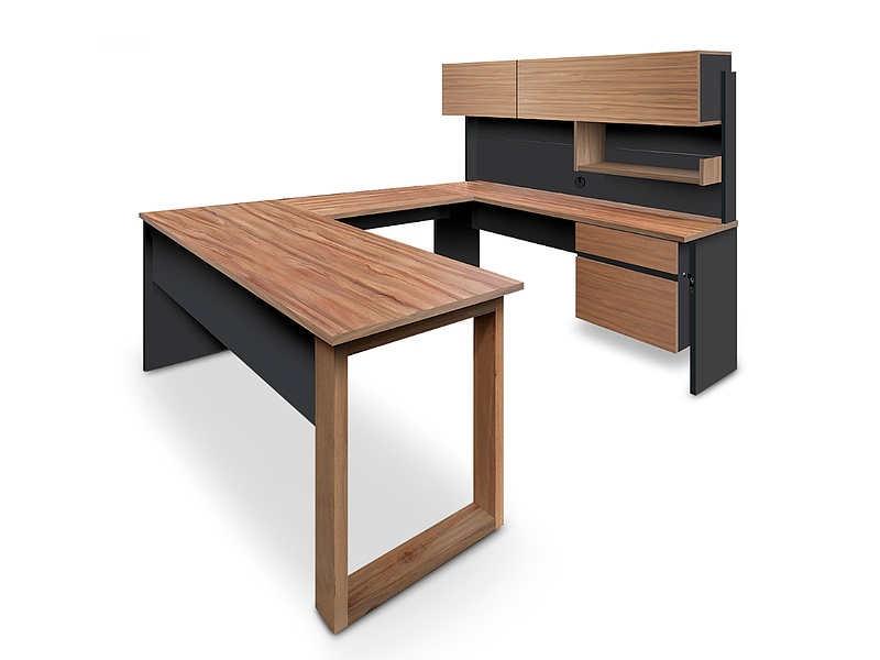 Escritorio amplio con un diseño elegante y profesional, ideal para oficinas o espacios de trabajo en casa. Incluye cajones y estantes para mantener documentos y suministros organizados.