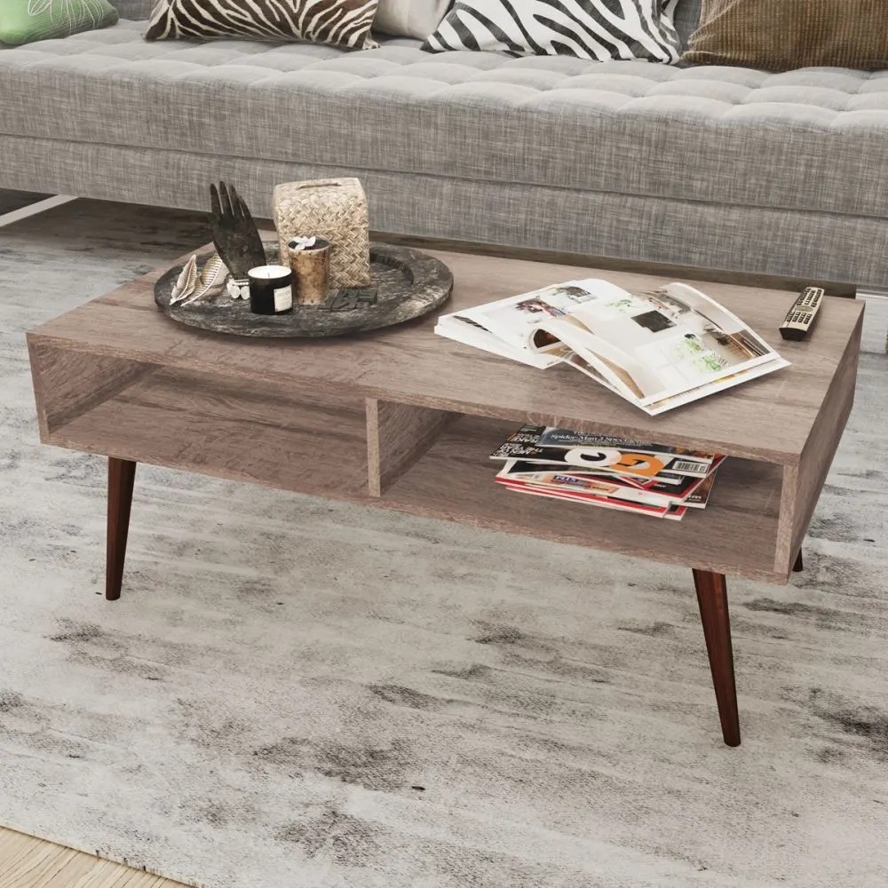 Mesa de centro de madera con diseño elegante y atemporal. Perfecta para cualquier sala de estar. Amplio espacio para colocar objetos decorativos o bebidas. Fácil de limpiar y mantener.