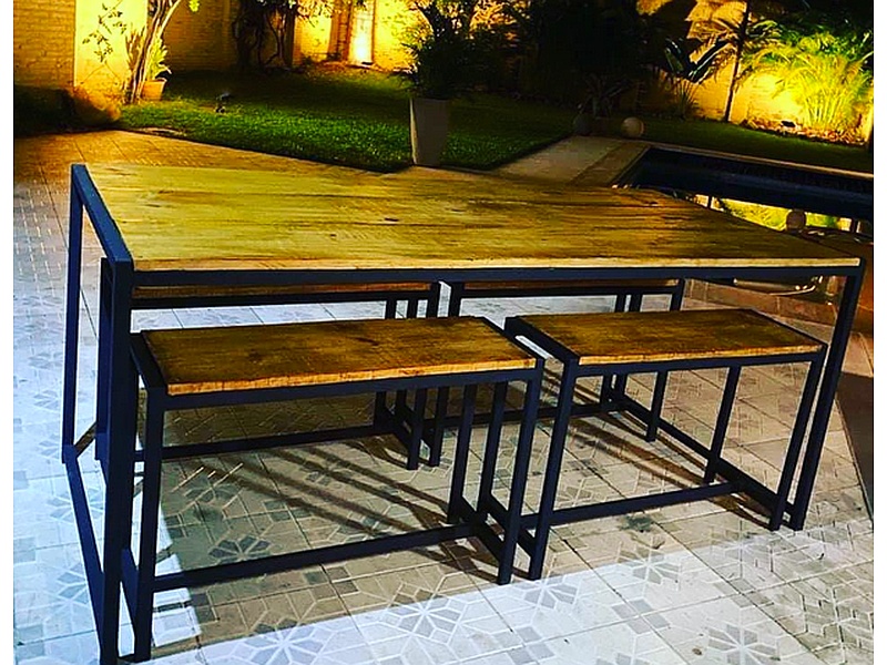 Comedor fabricado en metal y madera de acabado rustico.
