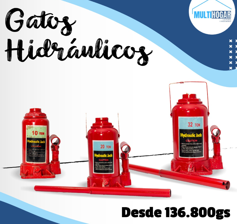 Gatos hidráulicos de alta capacidad, diseñados para levantar vehículos y maquinaria con facilidad. Fabricados con materiales de alta resistencia, estos gatos ofrecen una operación suave y segura, ideal para talleres y garages. Su mecanismo hidráulico garantiza un levantamiento preciso y eficiente.