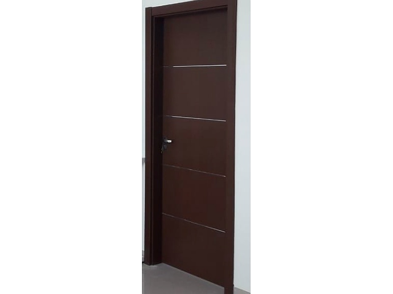 La puerta que se muestra en la imagen es una puerta interior de diseño elegante y sofisticado. Su color marrón oscuro y su acabado en madera le dan un aspecto cálido y natural. Los paneles horizontales y las líneas finas le confieren un toque de modernidad y sofisticación. Esta puerta es una excelente opción para aquellos que buscan un toque de elegancia y distinción en su hogar.