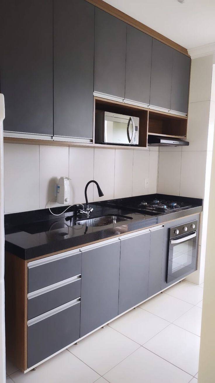 Mueble modular de cocina de color negro, de estilo elegante.
