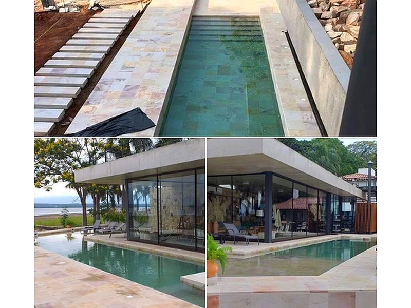 Piscina a orillas del lago 100% terminado. Totalmente de hormigón, cuenta con una zona de deck seco, deck húmedo y mesa para compartir.