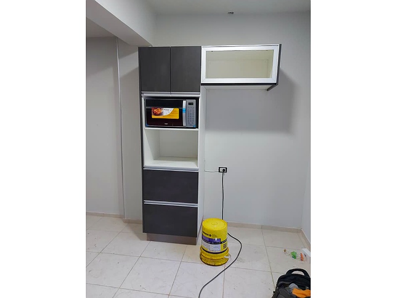 Armario diseñado para la cocina, con varios compartimentos que optimizan el espacio de almacenamiento.