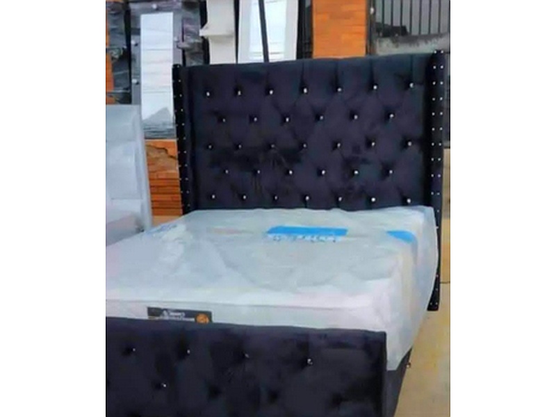 Cama con base y cabecero estilo capitone en color negro.