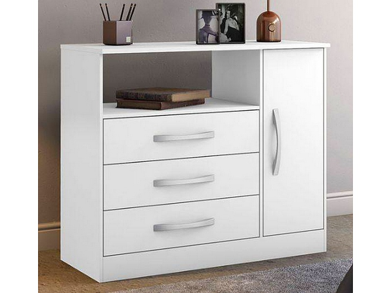Cómoda 3 cajones con una puerta en melamina color blanco.