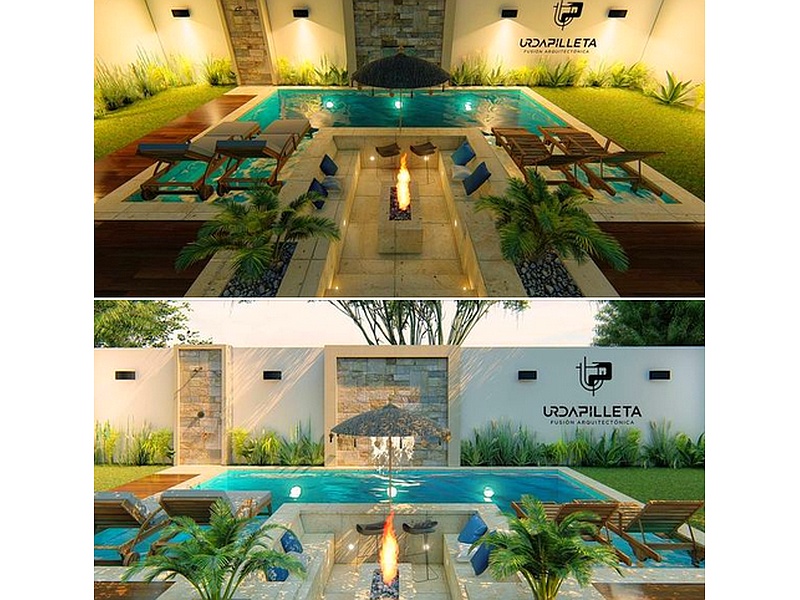 Diseño de piscina amplia con espacio para reposaderos, cascada y fogata.