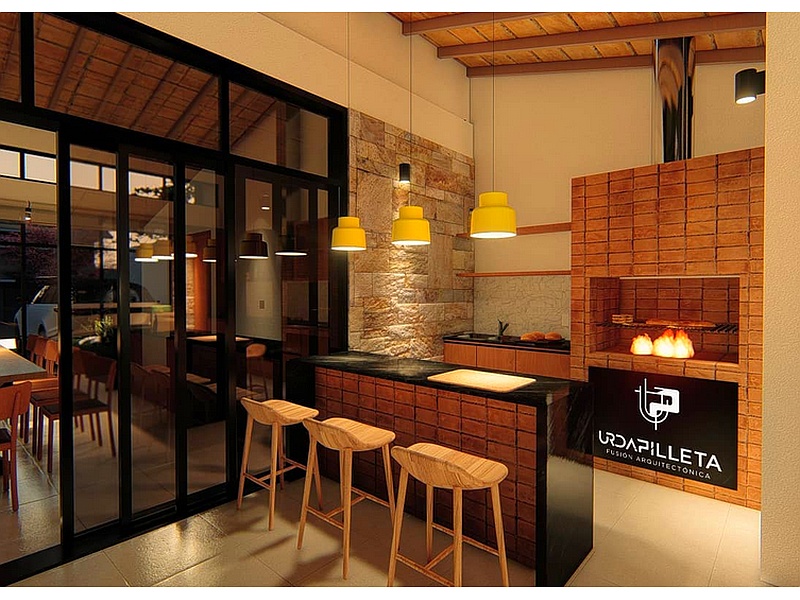 Quincho amplio con mesa para 14 personas y mesada con iluminación puntual colgante, paredes con detalles en piedra.