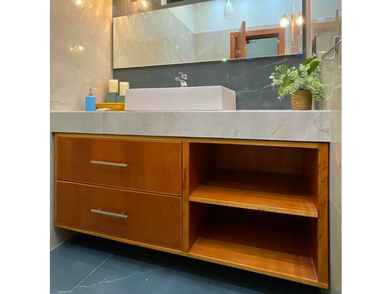 Mueble de baño suspendido en madera de cedro lustrada, con cajones y espacio al costado